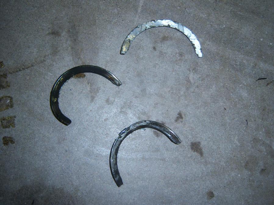 WOW, Here we go again with a weird one. We got the motor pulled out (the kids thought that was really fun!), and when I pulled the oil pan, then the windage tray, look what I found!! The picture of the 3 mysterious parts has me puzzled, because as I read Mitchells, it only mentions a thrust bearing on #2 rod (which is the other picture, and it was in place) The ones that are grouped in 3 were in the bottom and beat to you know what! PLEASE HELP ME HERE. I am thinking someone left the old thrust bearing in the engine??? or am I just missing something here. The rest looks great (only has 15K documented on the rebuild, so it should look OK!) Please help me/us on this one. If ANYONE has had one of these apart you will know what it is. P.S. 3VZE motor out of a 92 4R. Thanks again. Brad IN CASE THE PICTURE DO NOT POST.....They are exactly like the thrust bearing half moon piece on # 2 main bearing! (ONLY REALLY TORN UP, LIKE THEY HAVE BEEN BOUNCING AROUND...The one solo is what was on bearing #2.......PLEASE HELP Thanks